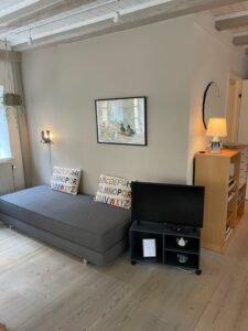 Baghuset er på hele 85 kvm fordelt på tre hyggelige etager og er ideelt til dem, der ønsker lidt ekstra charme og miljø i unikke omgivelser. Her får du en autentisk oplevelse i historiske rammer, hvor der er kælet for detaljerne, og hvor hver etage byder på sin egen stemning. Huset egner sig perfekt til både par, små familier eller gæster, der blot ønsker at nyde en rummelig base midt i byen, uden at gå på kompromis med ro og privatliv.