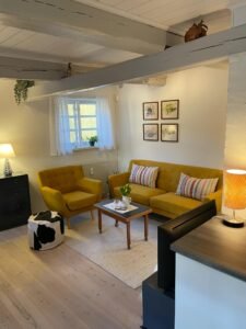 Begge huse har egen indgang, privat bad, tekøkken med køleskab, samt en hyggelig stue med spiseplads og sofa. Som gæst har du adgang til det stemningsfulde gårdmiljø med havemøbler, hvor du kan nyde roen midt i byen.